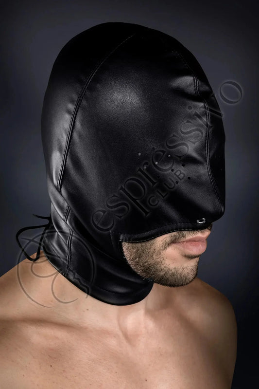 Open chin bondage hood with pinholes eyes for BDSM psychedelic effect